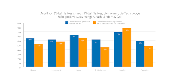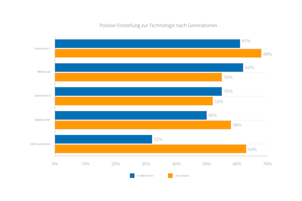 Dieser Trend bestand auch in anderen Ländern (siehe Tabelle unten), wobei die große Mehrheit der Gen X, Babyboomer und stillen Generation eine positive Sicht der Auswirkungen der Technologie auf unser Leben gewann. Die unten stehende Tabelle verdeutlicht den Anteil der Befragten, die diese positive Perspektive in den Generationen der Digital Natives (Millennials und Gen Z) und den nicht von klein auf mit digitaler Technologie vertrauten Generationen (Gen X, Babyboomer und stille Generation) teilen. Es ist hervorzuheben, dass in den USA die Akzeptanz in der Gen Z, unter den Millennials und in der Gen X, die Lebensverbesserungen als Ergebnis der Technologie betrachten, am höchsten ist. Die australischen Verbraucher teilten ähnliche Einstellungen, mit 54% der Gen X, aber nur 45% der Babyboomer und 41% der stillen Generation, die eine positive Sicht haben